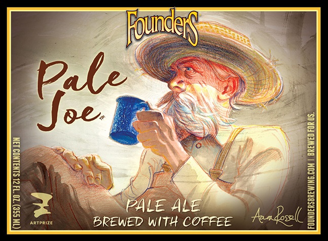 In addition to being a fun new release, Pale Joe is also the fourth beer brewed by Founders to benefit ArtPrize, “an international art competition [promoting] critical dialogue and collaboration through new, creative ideas among a large and diverse population of people.” ( Inspired Artist Black IPAMosaic Promise and Spectra Trifecta were the previous three ArtPrize releases from the brewery).  All employees at Founders Brewing Co. were given the opportunity to submit their artistic portfolio for the chance to create the label for Pale Joe.  Aaron Rossell, Lead Cellar Operator and Kendall College of Art & Design graduate, earned the honor of illustrating the label artwork thanks to his “striking character illustrations and unexpected use of color.”