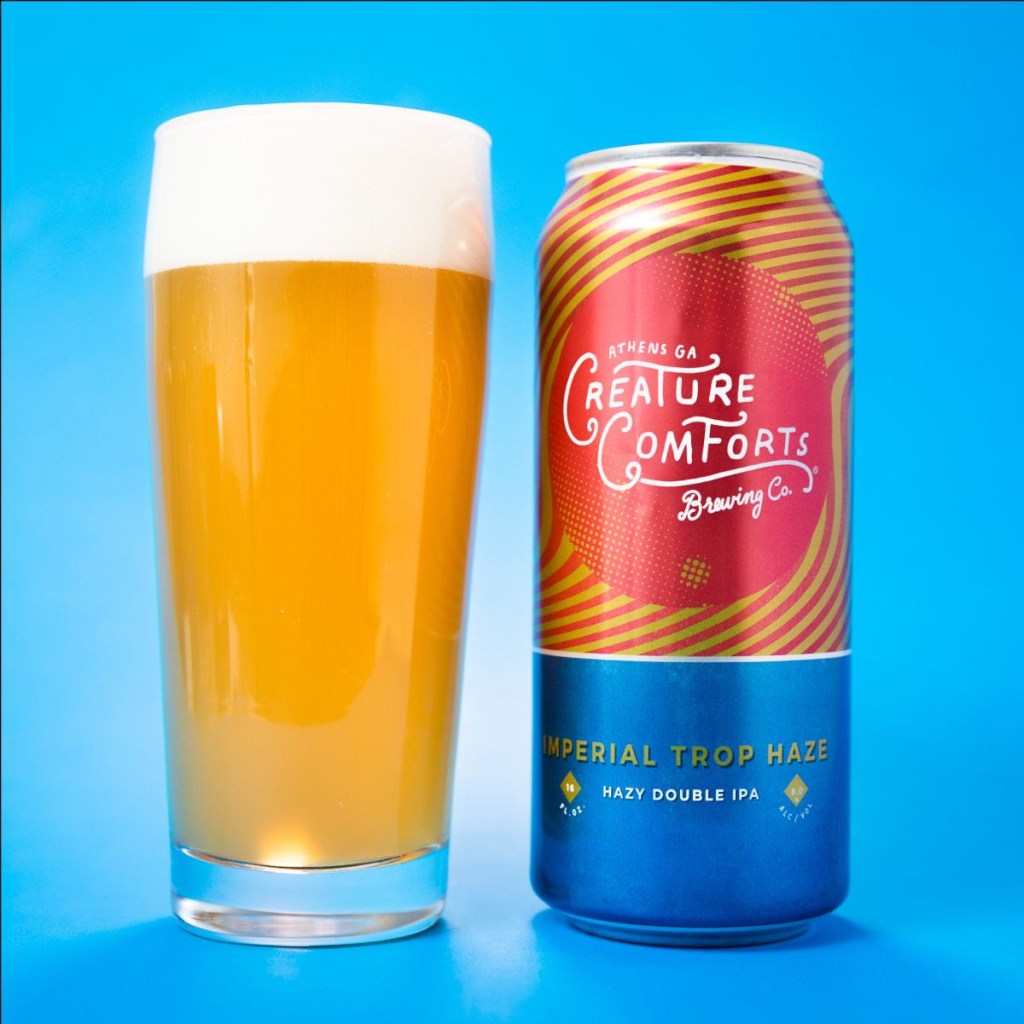 Created to be a bigger, hazier take on Creature Comforts Brewing Co.’s flagship IPA, Imperial Trop Haze is a Hazy/Juicy Double India Pale Ale “featuring Citra, Centennial, and Galaxy hops – the same hop varieties . . . [used] in [the brewery’s] beloved . . . Tropicália.” Weighing in at 8% ABV, Imperial Trop Haze “[finishes] with big tropical and citrus fruit notes and a full-bodied mouthfeel.”
