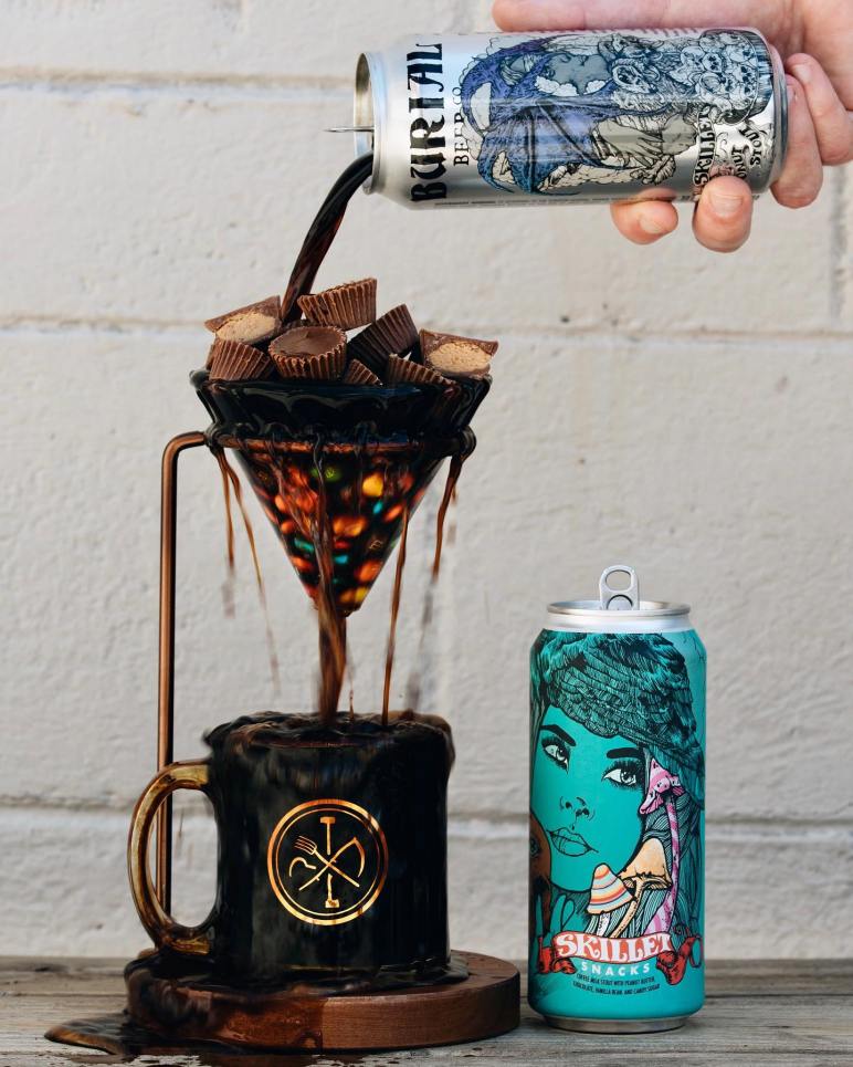 Concocted to be an even more decadent take on Burial’s infamous Skillet Donut Stout “made from a blend of nine barley malts, a healthy scoop of oats, milk and molasses sugars, and [their] favorite blend of freshly roasted Counter Culture Coffee beans,” Skillet Snacks takes the OG Skillet and “[ages it] upon heaps of house-made peanut butter, French Broad Chocolates Cocoa Nibs, fresh vanilla bean, and some candy sugars.” Coming in at 8% ABV, Skillet Snacks offers a “fistful of molten reeces cups chased with bags of M&M’s and washed down with caramel hot chocolate.”