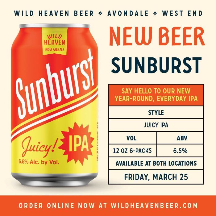Sunburst IPA is rolling out now with availability in 6-packs of 12 oz. cans and on draft. You can expect to find this new Year-Round at craft beer-focused establishments located within Wild Heaven’s distribution footprint in Alabama, Georgia, Tennessee and South Carolina. Prost!