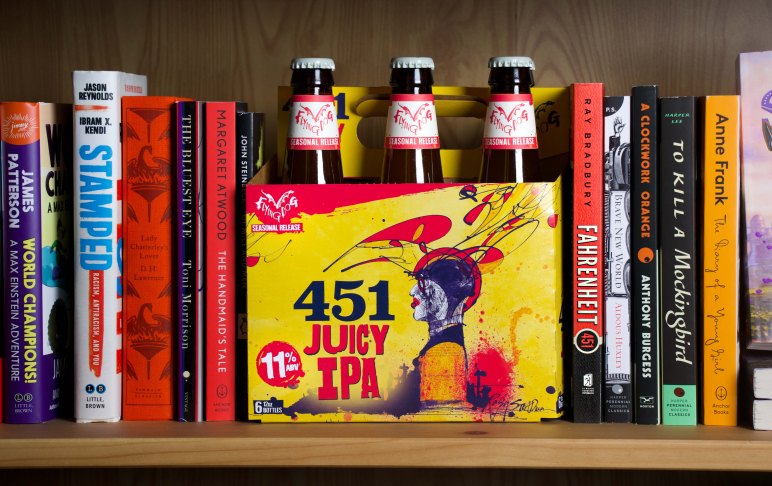 A response to the recent resurgence in book burning and banning and named after Ray Bradbury’s classic 1953 dystopian novel about censorship – Fahrenheit 451, 451 Juicy IPA is an Imperial Hazy/Juicy India Pale Ale that sees “95% of [its] hops . . . added late in the process, this dry hopping amps up the aroma and flavor while keeping the beer’s bitterness low, letting 451’s juicy fruit flavors dominate.” Coming in at an “incredibly approachable and drinkable” 11% ABV, 451 Juicy IPA is a “medium bodied imperial [that stays] soft on the palette with its alcohol content being nearly unnoticeable in the flavor.”