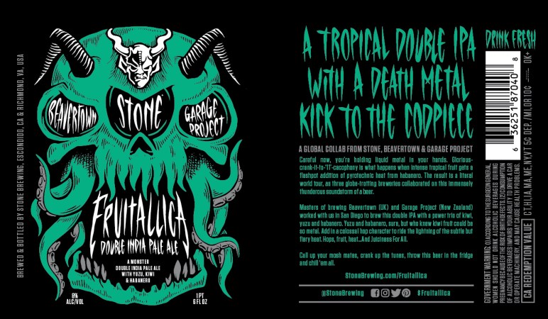 Stone Brewing (Escondido, California) has officially announced the release of Fruitallica Double India Pale Ale, a new collaboration offering featuring the talents of Beavertown (London, England) and Garage Project (Wellington, New Zealand).