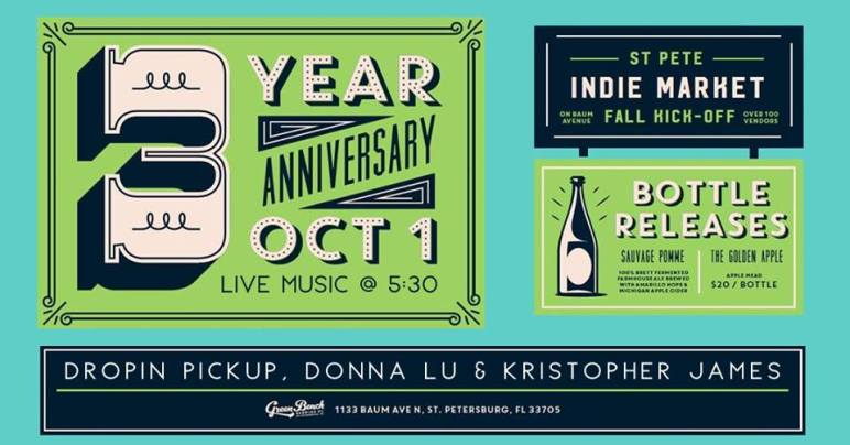 green-bench-logoOn Saturday, October 1 from 11 a.m. to close, Green Bench Brewing Co. (1133 Baum Ave N, Saint Petersburg, Florida) will be in full party mode to celebrate the brewery’s 3 Year Anniversary.