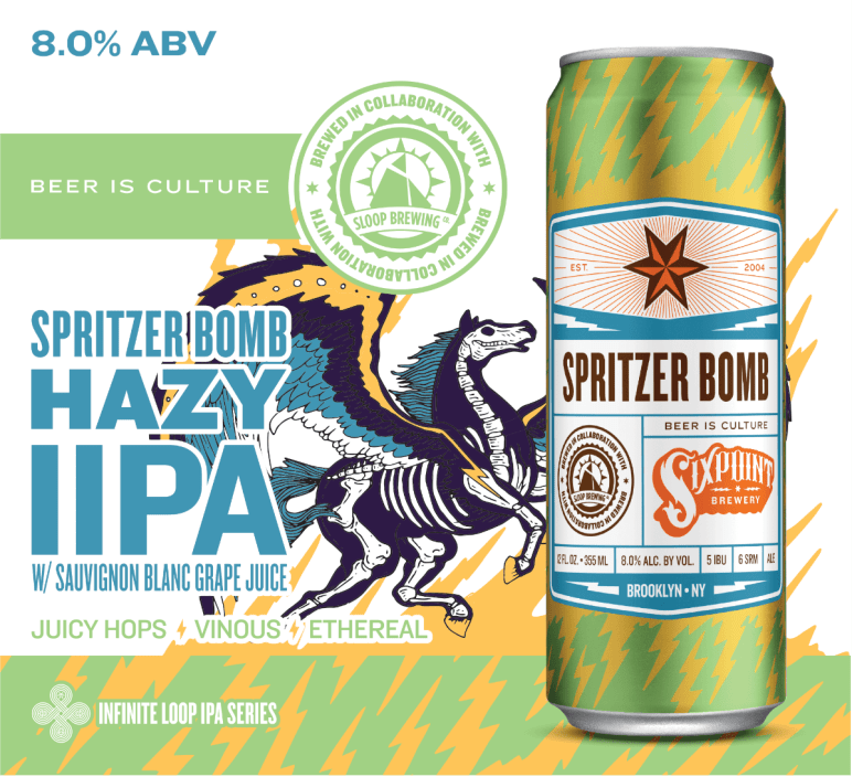 Crafted to bring “the source material of Sloop’s iconic Juice Bomb [Northeastern IPA]” together with “Sixpoint’s foray into grain-grape combinations in the small batch Spritzer series,” Spritzer Bomb is a Hazy/Juicy Imperial India Pale Ale that merges brewing “techniques of both breweries” with a mild twang sourced from “the use of Sauvignon Blanc grapes, which are a perfect compliment for the profile.”  Weighing in at a deceptive 8% ABV, Spritzer Bomb is “an incredibly refreshing Hazy IPA and extremely easy to drink even at the high ABV.”